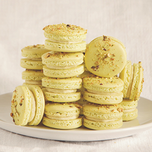 - Sprinkle some coarsely ground pistachios on alternating rows of macarons (the ones with the pistachios will be the top macaron shell).