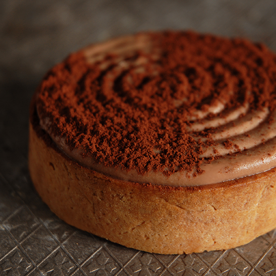3. Using a medium-large round piping tip, pipe a spiral of milk chocolate cremeux onto each tart, starting from the outside. You can also decorate with cremeux another way, if you wish.